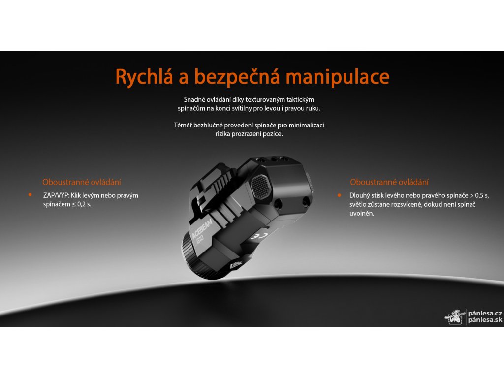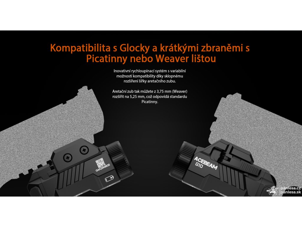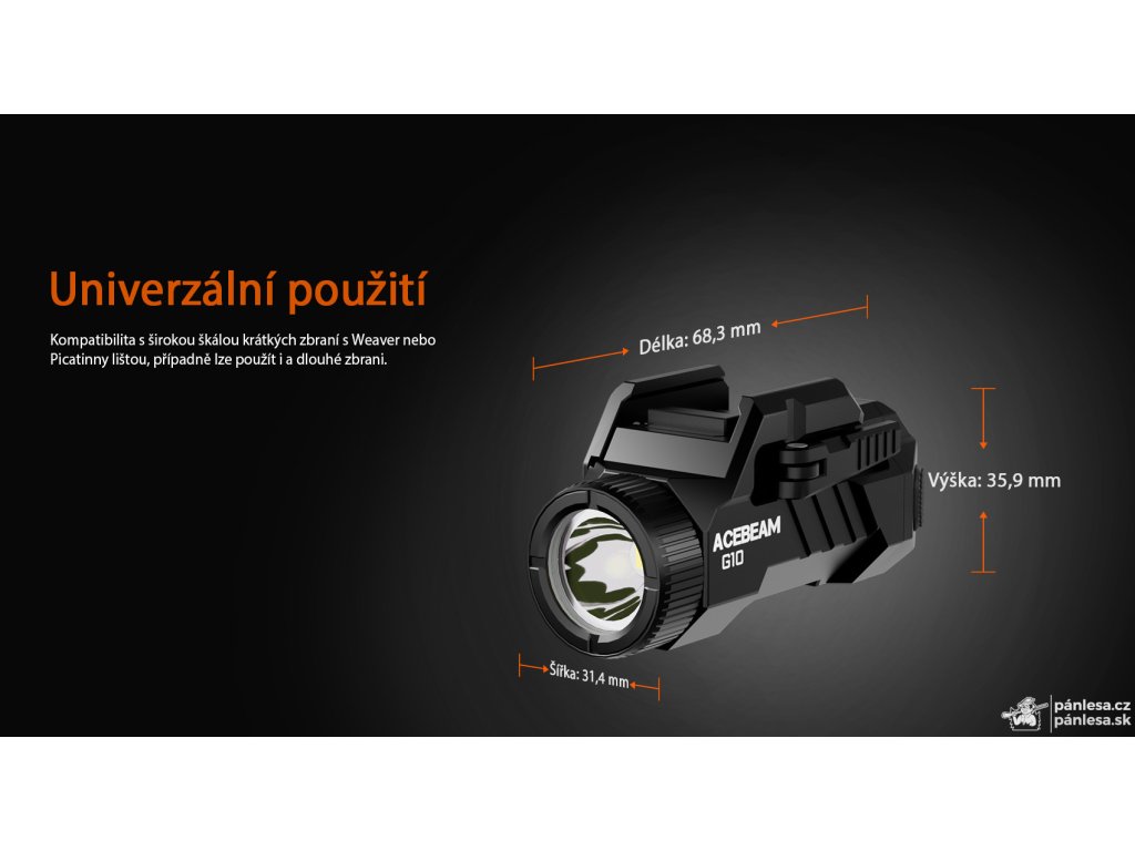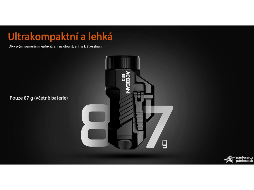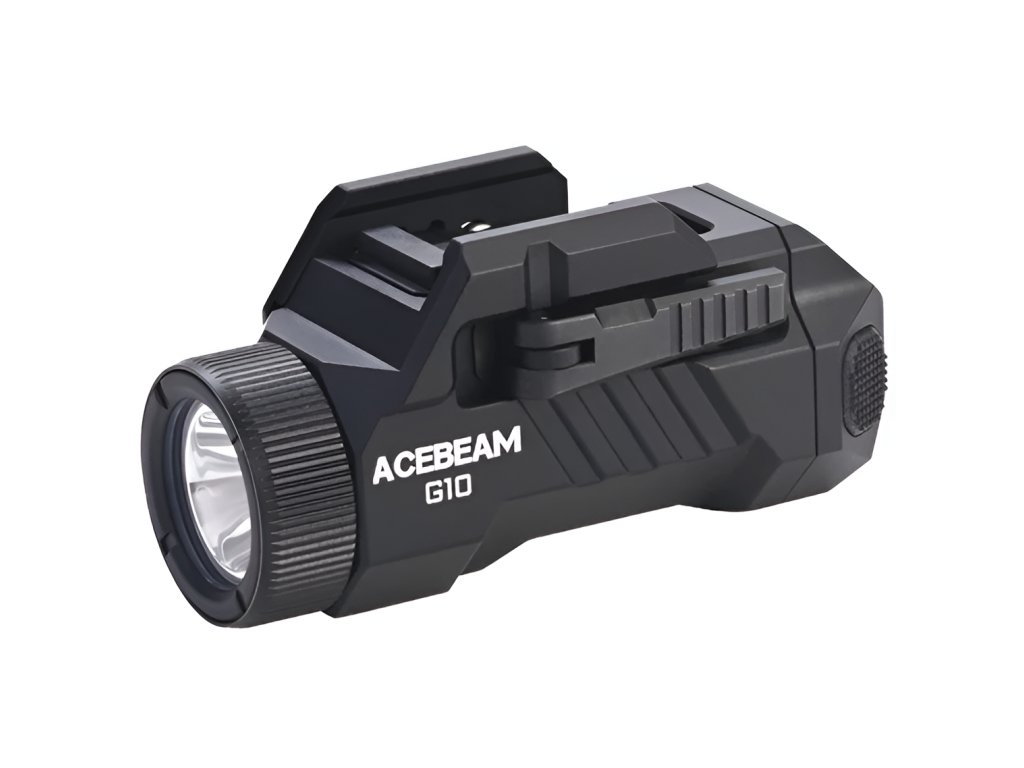 Baterka AceBeam G10 určená predovšetkým na použitie s krátkymi zbraňami ponúka unikátny rýchloupínací mechanizmus a vysoký výkon. Ako hlavná dióda bola použitá LED SFT-25R s maximálnym výkonom 600 lumenov a jasom 10 000 nitov, čo v praxi znamená dosvit až do vzdialenosti 200 metrov. G10 má extrémne nízku hmotnosť, len 87 gramov vrátane akumulátora! Na zbrani sa počíta každý gram a toto je jeden z kľúčových parametrov. Ďalším zásadným faktorom je samotná kompatibilita. Táto baterka ponúka unikátny rýchloupínací mechanizmus, ktorého výnimočnosť spočíva v aretačnom zube. Ten je možné rozšíriť pomocou sklopnej doštičky z 3,75 mm (Weaver) na 5,25 mm (Picatinny), čo zaručuje maximálne uchytenie na oboch typoch líšt.