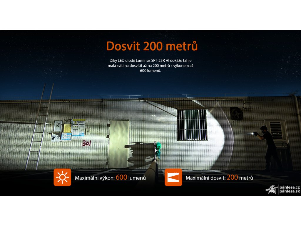 - Dióda 1x LED SFT-25R - Svetelný tok 600 lm - Chromatickosť 6500K (studená biela) - Jas 10000 nt - Dosvit 200 m - 1 režim osvetlenia (Vysoký) - Hmotnosť 87 g (s akumulátorom) - Odolnosť IP68 (ponor do hĺbky dvoch metrov) - Napájanie pomocou jednej batérie 16340 850 mAh s USB-C portom (alternatívne je možné použiť CR123A) - Telo vyrobené z hliníkovej zliatiny s povrchovou úpravou HAIII - Tvrdené ultra číre sklo s antireflexnou úpravou - Dva pogumované spínače pre ľavú aj pravú ruku - Unikátny rýchloupínací mechanizmus zaisťuje maximálnu fixáciu na Weaver aj Picatinny lištách - Aretačný zub je možné rozšíriť z 3,75 mm (Weaver) na 5,25 mm (Picatinny) - Čierna farba
