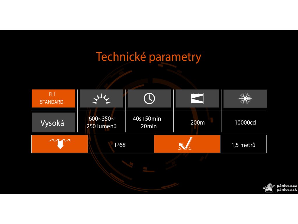 - Dióda 1x LED SFT-25R - Svetelný tok 600 lm - Chromatickosť 6500K (studená biela) - Jas 10000 nt - Dosvit 200 m - 1 režim osvetlenia (Vysoký) - Hmotnosť 87 g (s akumulátorom) - Odolnosť IP68 (ponor do hĺbky dvoch metrov) - Napájanie pomocou jedného akumulátora 16340 850 mAh s USB-C portom (alternatívne je možné použiť CR123A) - Telo z hliníkovej zliatiny s povrchovou úpravou vytvorenou pomocou plazmovej elektrolytickej oxidácie (MAO) - Tvrdené ultra číre sklo s antireflexnou úpravou - Dva pogumované spínače pre ľavú aj pravú ruku - Unikátny rýchloupínací mechanizmus zaisťuje maximálnu fixáciu ako pri Weaver, tak aj Picatinny lištách - Aretačný zub je možné rozšíriť z 3,75 mm (Weaver) na 5,25 mm (Picatinny) - MAO povrchová úprava vytvára svetlosivý mramorový efekt