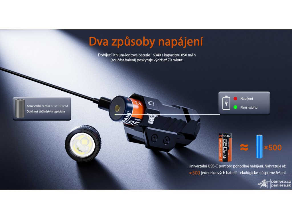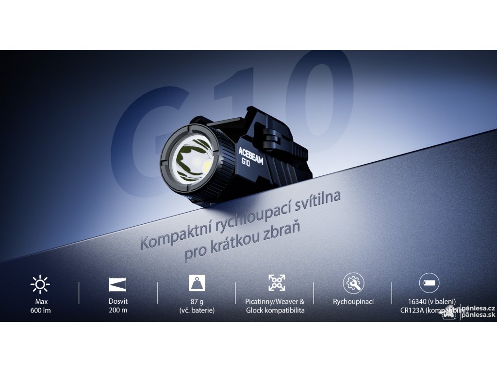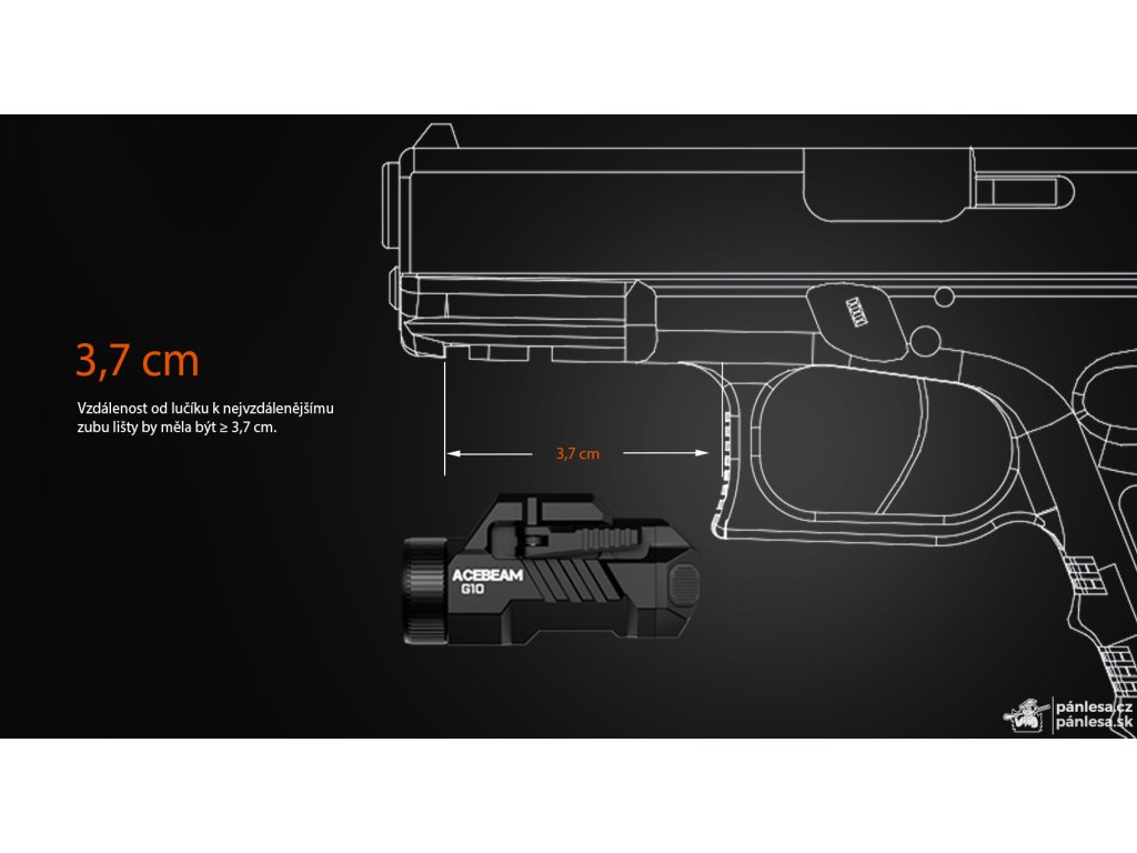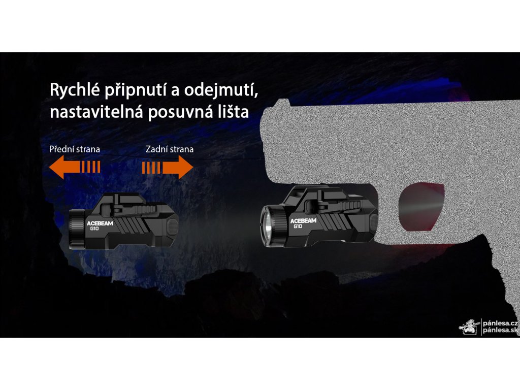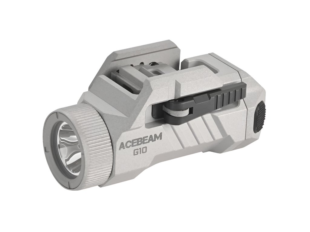 Baterka AceBeam G10 určená predovšetkým na použitie s krátkymi zbraňami ponúka unikátny rýchloupínací mechanizmus a vysoký výkon. Ako hlavná dióda bola použitá LED SFT-25R s maximálnym výkonom 600 lumenov a jasom 10 000 nitov, čo v praxi znamená dosvit až do vzdialenosti 200 metrov. G10 má extrémne nízku hmotnosť, len 87 gramov vrátane akumulátora! Na zbrani sa počíta každý gram a toto je jeden z kľúčových parametrov. Ďalším zásadným faktorom je kompatibilita. Táto baterka ponúka unikátny rýchloupínací mechanizmus, ktorého výnimočnosť spočíva v aretačnom zube. Ten je možné rozšíriť pomocou sklopnej doštičky z 3,75 mm (Weaver) na 5,25 mm (Picatinny), čo zaručuje maximálne uchytenie na oboch typoch líšt.