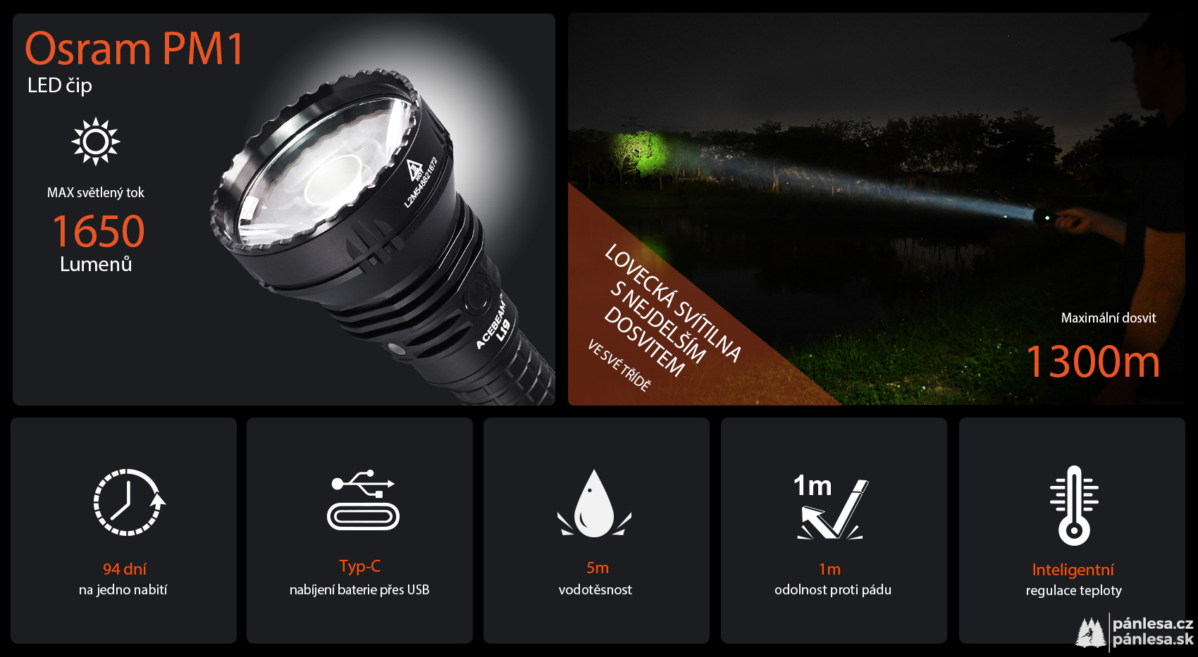 Baterky AceBeam radu L sú určené pre taktické a lovecké využitie. Model L19 2.0 je vylepšenou verziou veľmi obľúbenej baterky, ktorá ponúka na svoju triedu vynikajúce funkcie a nevídanú dokonalosť v každom detaile. Verzia s LED čipom Osram PM1 dosahuje hodnotu svetelného toku 1650 lúmenov a dosvit je neuveriteľných 1300 metrov. Intenzitu je možné prepínať medzi siedmimi režimami - mesačný svit, nízka, stredná1, stredná2, vysoká a turbo, pri ktorom dosahuje hodnotu 1650 lúmenov. A ako posledný je tu stroboskopický režim. Baterka si navyše po vypnutí pamätá naposledy zvolenú intenzitu a pri opätovnom zapnutí sa zapne v tomto režime.
