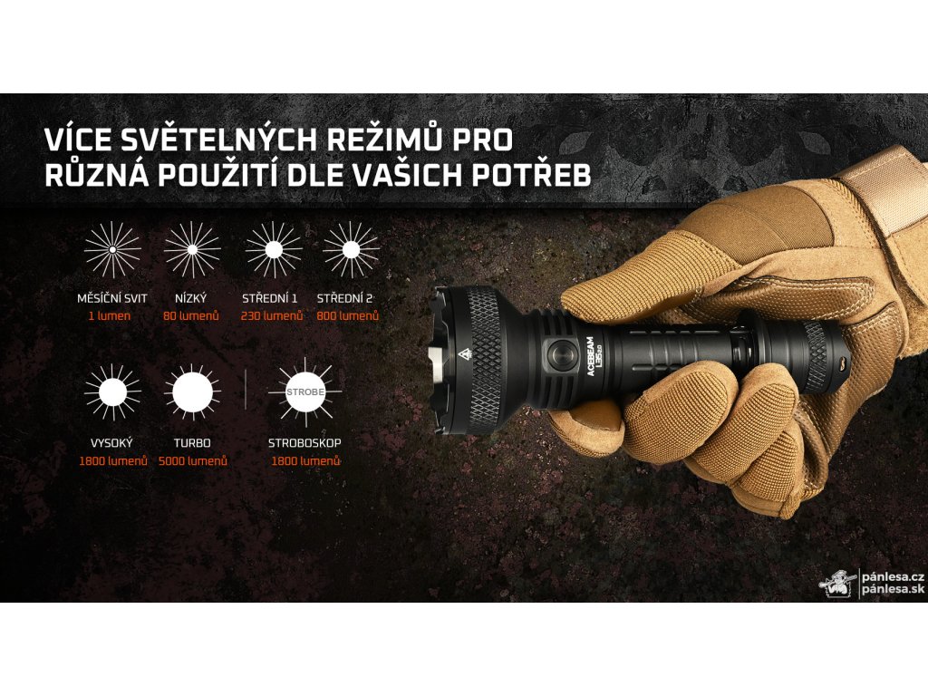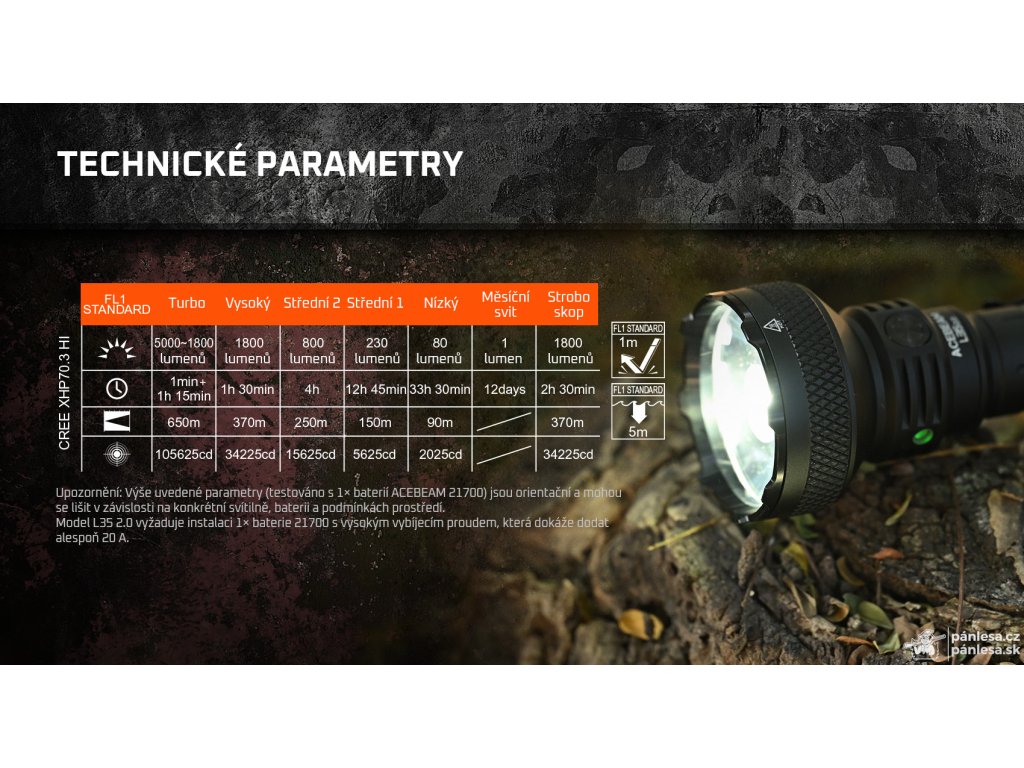 Baterky AceBeam radovej série L sú určené na taktické a poľovnícke použitie. Model L35 2.0 je ideálnou voľbou najmä pre taktické účely, a to vďaka vysokému výkonu a kompaktným rozmerom. Verzia s LED diódou CREE XHP70.3 HI dosahuje svetelný tok 5000 lumenov, jas 105625 nitov a dosvit až 650 metrov. Intenzitu je možné prepínať medzi siedmimi režimami – mesačný svit, nízky, stredný1, stredný2, vysoký a turbo režim, pri ktorom dosahuje hodnotu 5000 lumenov. Posledný režim je stroboskop. Baterka si po vypnutí pamätá naposledy zvolený režim a po opätovnom zapnutí sa spustí v rovnakom nastavení.