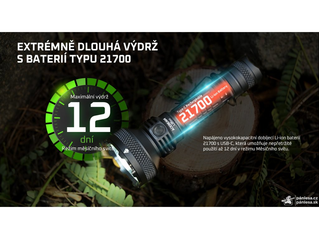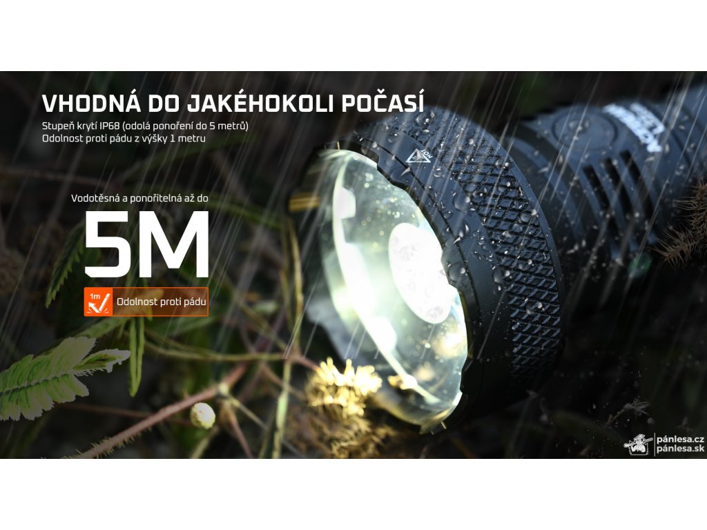 - Dióda 1x CREE XHP70.3 HI - Svetelný tok 5000 lm - Chromatickosť 6500K (studená biela) - Jas 1056250 nt - Dosvit 650 m - 7 režimov svietenia (Mesačný svit, nízky, stredný 1, stredný 2, vysoký, turbo a stroboskop) - Bočné tlačidlo z nehrdzavejúcej ocele - Zadný dvojpolohový taktický spínač - Indikátor stavu batérie - Hmotnosť 250 g s batériou - Odolnosť IP68 (ponor do hĺbky 5 metrov) - Odolnosť voči pádu z výšky 1 metra - Napájanie pomocou jednej batérie 21700 - Nabíjanie cez USB-C port priamo v batérii - Výdrž až 12 dní v režime Mesačný svit - Telo zo zliatiny hliníka s povrchovou úpravou HAIII, odolnou voči mechanickému poškodeniu - Úderný krúžok z nehrdzavejúcej ocele - Rebrovanie pre lepší odvod tepla - Batéria s dvojitou pružinou zabraňuje prerušeniu napájania pri použití úderného krúžku - Možnosť montáže na zbraň pomocou príslušenstva - Oceľový klip - Čierna farba