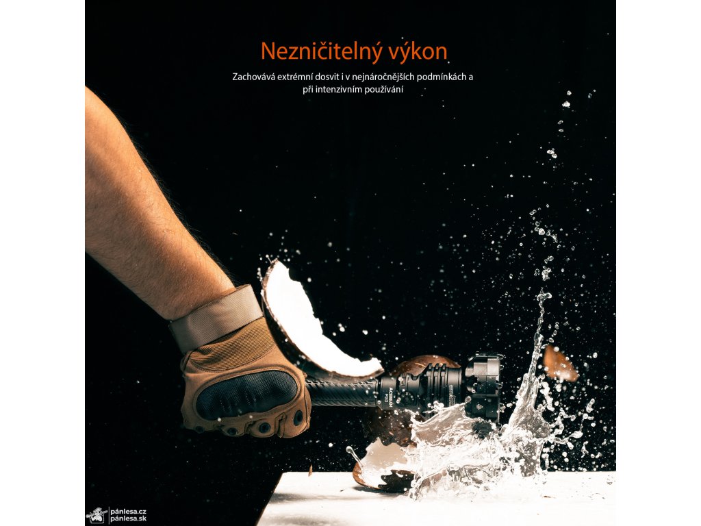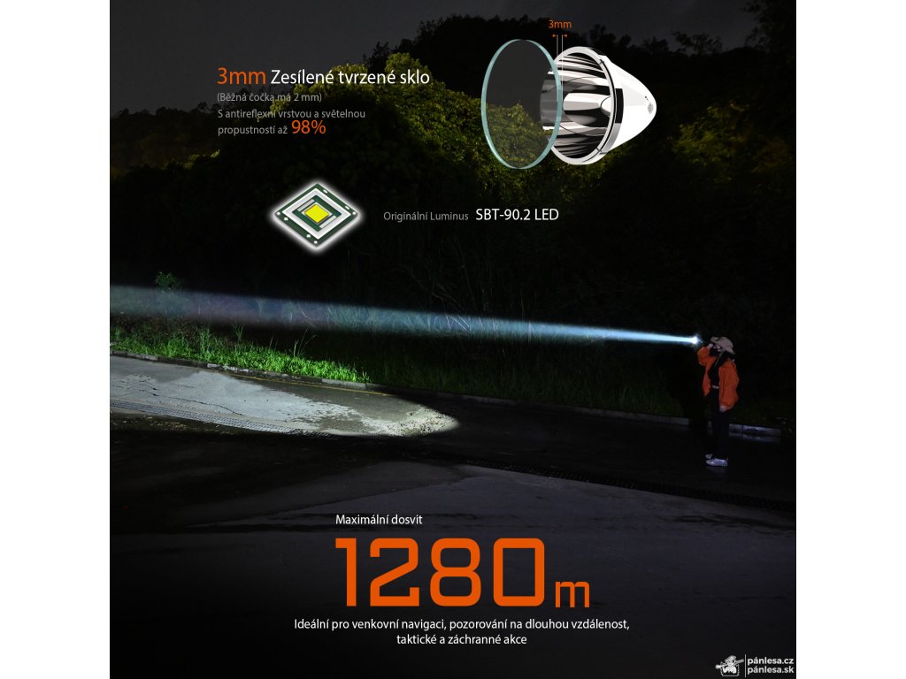 - Dióda 1x Luminus SBT90.2 - Svetelný tok 5500 lm - Chromatickosť 5700K (studená biela) - Jas 409600 nt - Dosvit 1280 m - 7 režimov osvetlenia (ultra-nízky, nízky, stredný 1, stredný 2, vysoký, turbo a stroboskop) - Bočný spínač s indikátorom nabitia - Zadný dvojpolohový taktický spínač - Hmotnosť 504 g s batériou - Odolnosť IP68 (ponor do hĺbky 2 metrov) - Odolnosť voči pádu z výšky 1,5 metra - Napájanie pomocou batériového bloku s dvoma akumulátormi 21700 (alternatívne 2 samostatné batérie 21700) - Nabíjanie cez USB-C port priamo v batériovom bloku - Telo z hliníkovej zliatiny s povrchovou úpravou HAIII odolnou voči mechanickému poškodeniu - Úderný krúžok z nerezovej ocele - Rebrovanie pre lepší odvod tepla - Batéria s dvojitou pružinou zabraňujúca prerušeniu napájania pri použití úderného krúžku - Čierna farba