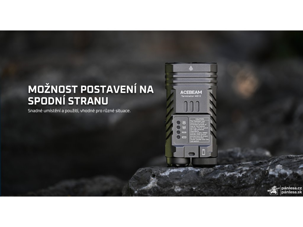 AceBeam Terminator M2-X je odľahčená verzia prelomového modelu M1. M2-X funguje na rovnakom princípe, teda kombinácia širokého osvetlenia a bodového reflektora, ktorý je v tomto prípade pri oboch variantoch vybavený LED technológiou. Tieto dva režimy sú navyše doplnené o RGB diódy, ktoré ponúkajú možnosť farebného svietenia. To všetko v kompaktnom a ľahkom tele, vhodnom na každodenné nosenie. Intenzitu možno prepínať medzi pätnástimi (!) režimami – mesačný svit, nízky, stredný1, stredný2, vysoký a turbo, pri ktorom dosahuje hodnotu 3200 lumenov. Ďalej sú k dispozícii režimy svietenia bodovým reflektorom na vysoký výkon, kombinácia bodového reflektora a širokého svetla na vysoký výkon a stroboskop, a nakoniec aj RGB režimy – striedanie siedmich farieb, červené, zelené a modré svetlo, zelený signál a červené SOS. Baterka si navyše po vypnutí pamätá naposledy zvolený režim a po opätovnom zapnutí sa aktivuje v tomto režime.