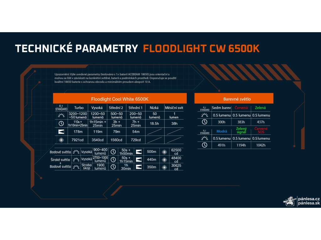 - Dióda 3x LED Floodlight 6500K CW, 1x LED Spotlight 6500K CW a RGB LED diódy - Svetelný tok 3200 lm (v režime bodového reflektora 900 lm) - Chromatičnosť 6500K (studená biela) - Jas 62500 nt - Dosvit 500 m (v režime bodového reflektora) - 15 režimov osvetlenia (Mesačný svit, nízka, stredná1, stredná 2, vysoká, turbo, vysoká (bodový reflektor), vysoká (bodový reflektor + široké svetlo), stroboskop (bodový reflektor + široké svetlo), sedem farieb, červená, zelená, modrá, zelený signál a červené SOS) - Duálna hlava - Hmotnosť 201,1 g s akumulátorom - Odolnosť IP68 (ponor do hĺbky dvoch metrov) - Odolnosť proti pádu z výšky 1,5 metra - Napájanie pomocou 1x 18650 - Nabíjanie cez USB-C port zabudovaný v akumulátore - Indikátor stavu batérie - Indikátor zvoleného režimu svietenia - Telo vyrobené zo zliatiny hliníka s povrchovou úpravou HAIII, ktorá vyniká odolnosťou proti mechanickému poškodeniu - Tvrdené ultra čisté sklo s antireflexnou úpravou - Možnosť postavenia na spodnú hranu a použitie baterky ako sviece - Dva spínače - Zelená farba - Oceľový odnímateľný klip