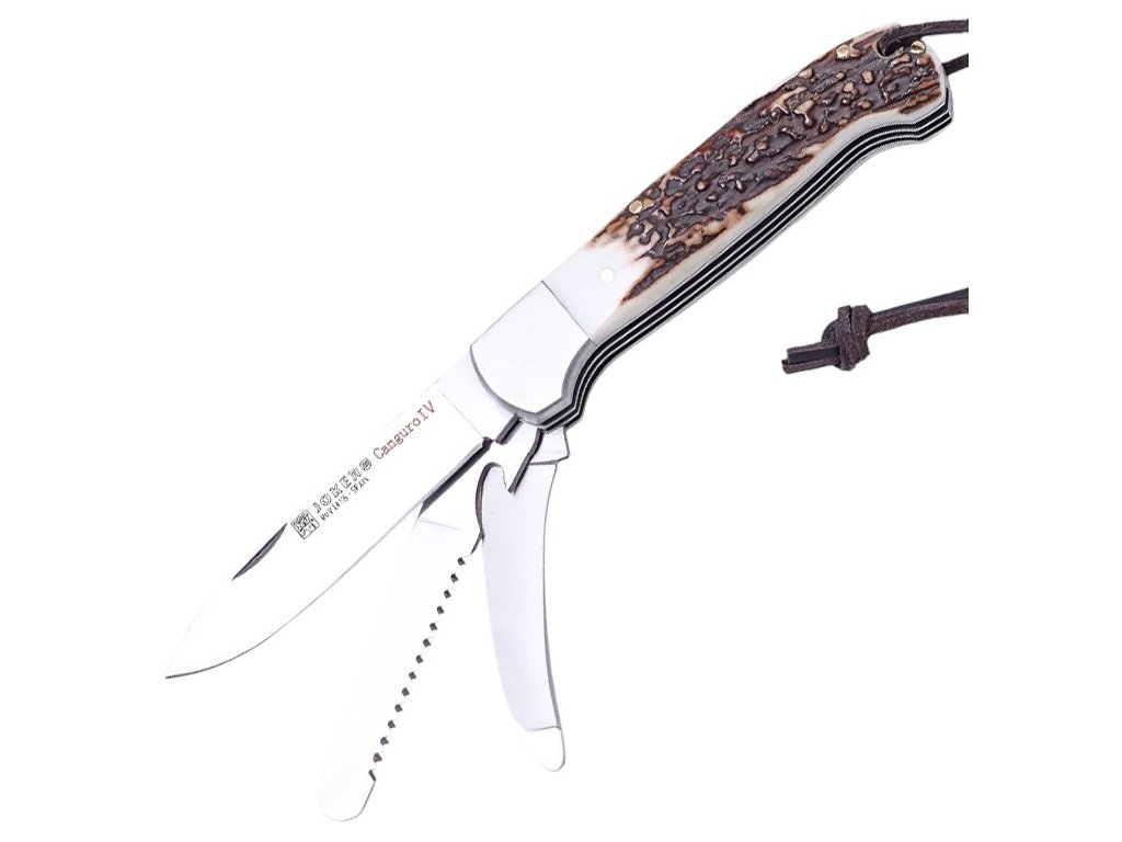 Španielsky výrobca Joker je tradičný výrobca z tradičnej liahne nožov – mesta Albacete. Nôž Canguro IV patrí do série multifunkčných nožov a je skvelým spoločníkom do prírody, predovšetkým vďaka viacerým funkciám. Ide už o štvrtú aktualizáciu tohto bestselleru, ktorý ponúka tri čepele – nôž, dvojradovú pílu a párák. Nôž ďalej disponuje vonkajšou poistkou proti nechcenému zatvoreniu, koženou šnúrkou, črienkami z parožia a otváračom na fľaše. Vysoko odolná konštrukcia podčiarknutá veľmi kvalitným spracovaním.